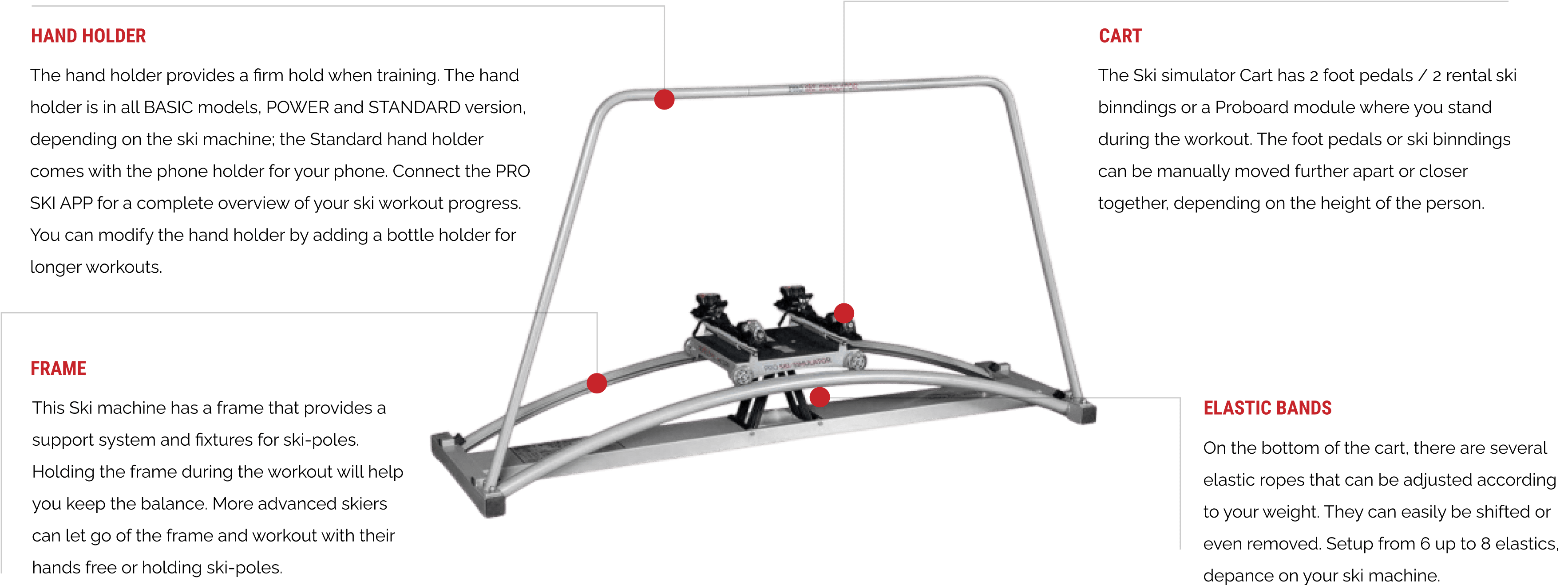 The Ski simulator Cart has 2 foot pedals, where you stand during the workout. The foot pedals can be manually moved further apart or closer together, depending on the height of the person.